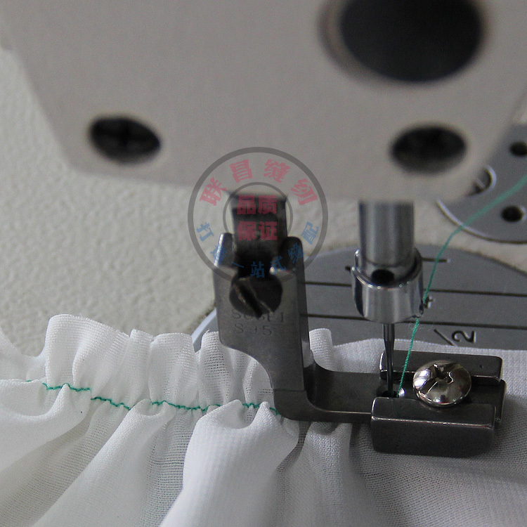 Лапка з двома змінними насадками для різного ступеня складання тканини. Регулювання величини складок (прісбаріванія) досягається шляхом переміщення зсувного сегмента по осі лапки - чим далі сегмент від голки, тим більше збірка, чим ближче до голки, тим збірка менше.