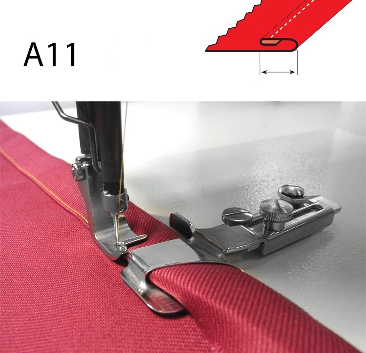 Пристосування підгинає край тканини у 2-а складання (закритий зріз). Рубильник накладний кріпиться гвинтами. Може відсуватися, якщо операція "підгинання" тимчасово не здійснюється.